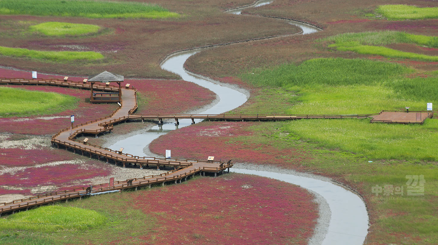 칠면초와 학명으로 퉁퉁마디라고 불리는 빨간 함초 군락지가 갯벌을 붉게 물들이고, 하얀색 삐비꽃이 바람에 맞춰 정겨운 춤사위를 펼치는 곳.