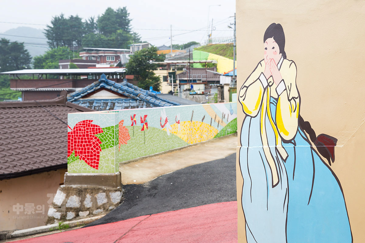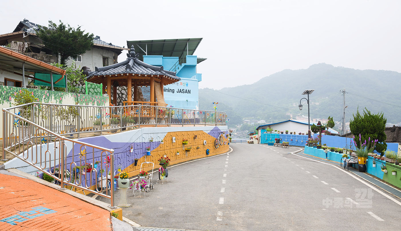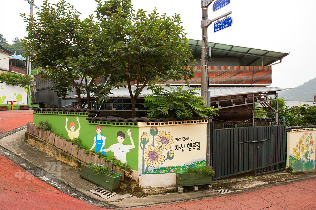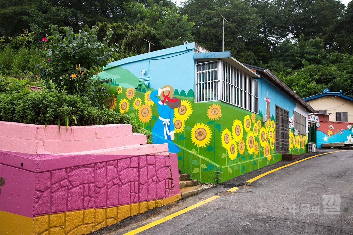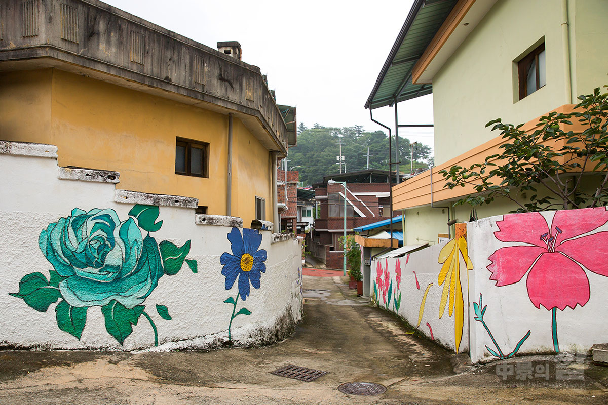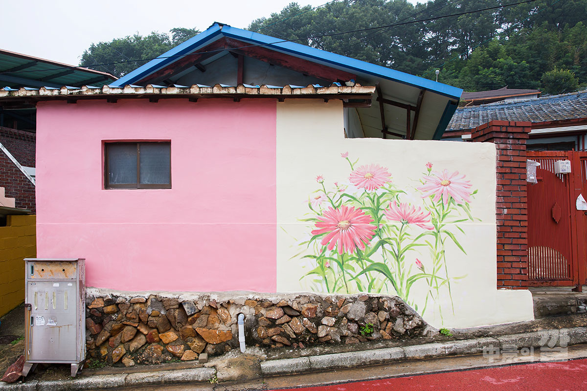 긴 장마로 인해 비가 내리는 가운데 촬영된 '자산동 벽화마을'은