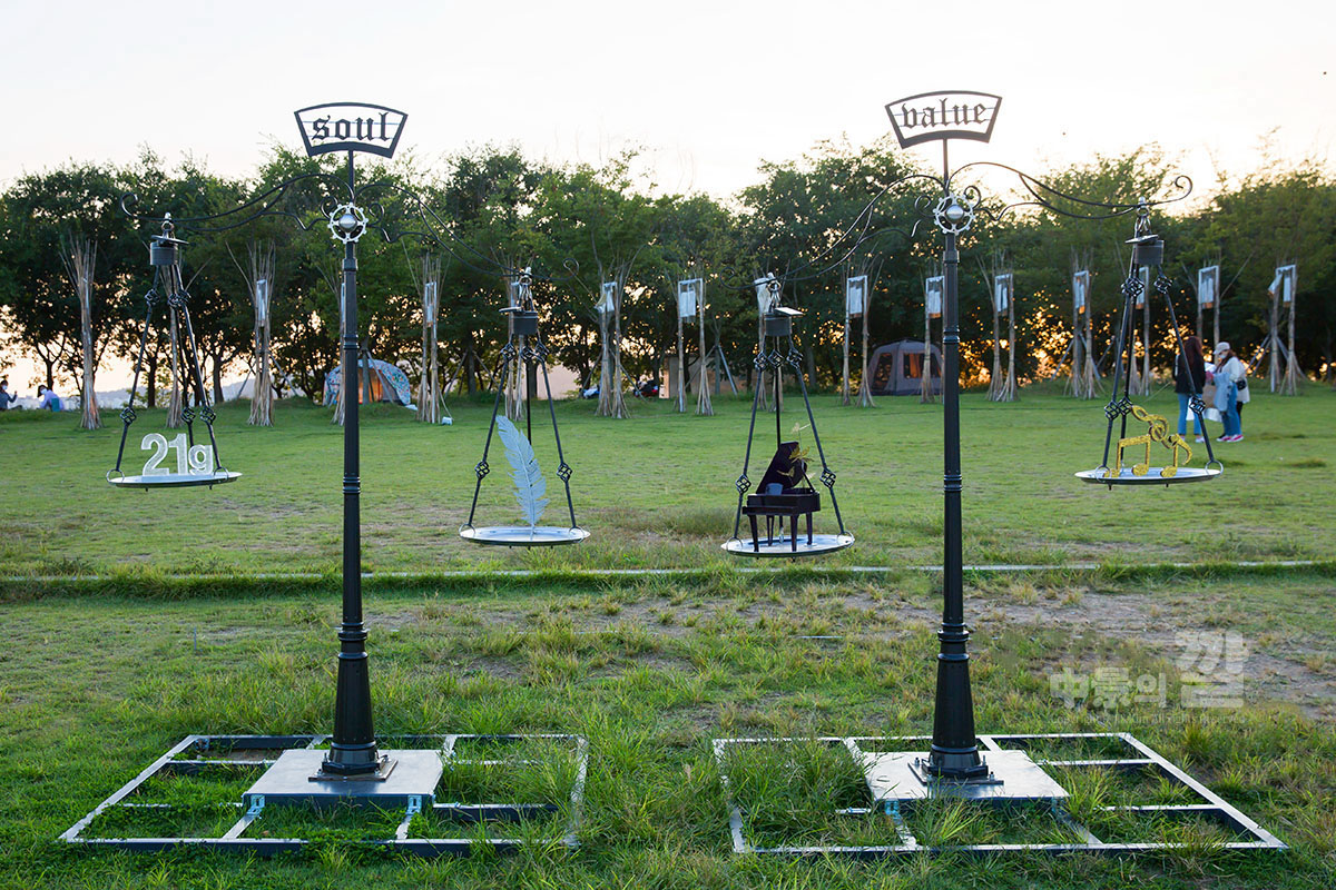 길을 밝히는 가로등을 모티브로 제작된 양팔저울에 가벼운 쪽엔 음표, 무거운 쪽엔 피아노 형상을 두어