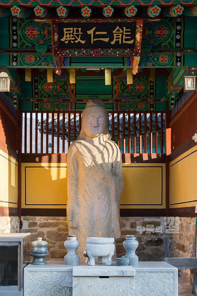 오른손은 아래로 내려 손바닥을 바깥으로 한 ²여원인을, 왼손은 가슴에 대고 있는 독특한 수인을 하고 있다.