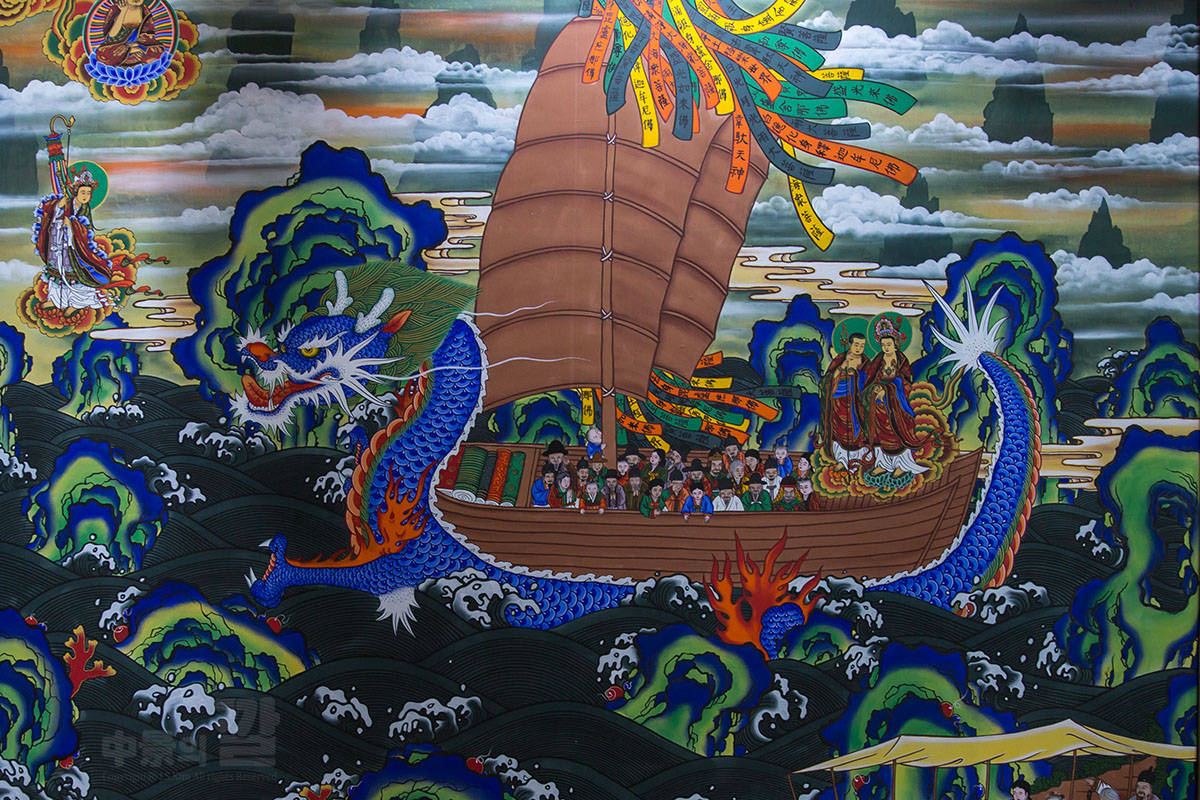 새겨져 있다. 지붕의 두꺼운 추녀 밑은 위로 살짝 들려있고, 낙수면은 급한 편이며 지붕 선 끝부분에 꽃 장식이 달려 있다.